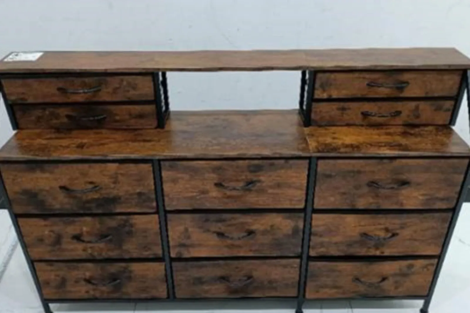 The dressers are produced in rustic brown, pink, white and black colors, and feature a wooden top and metal frame. The 12-drawer dressers measure around 52 inches, by 12 inches, by 35 inches. The 13-drawer dressers measure around 35 inches, by 11 inches, by 55 inches.