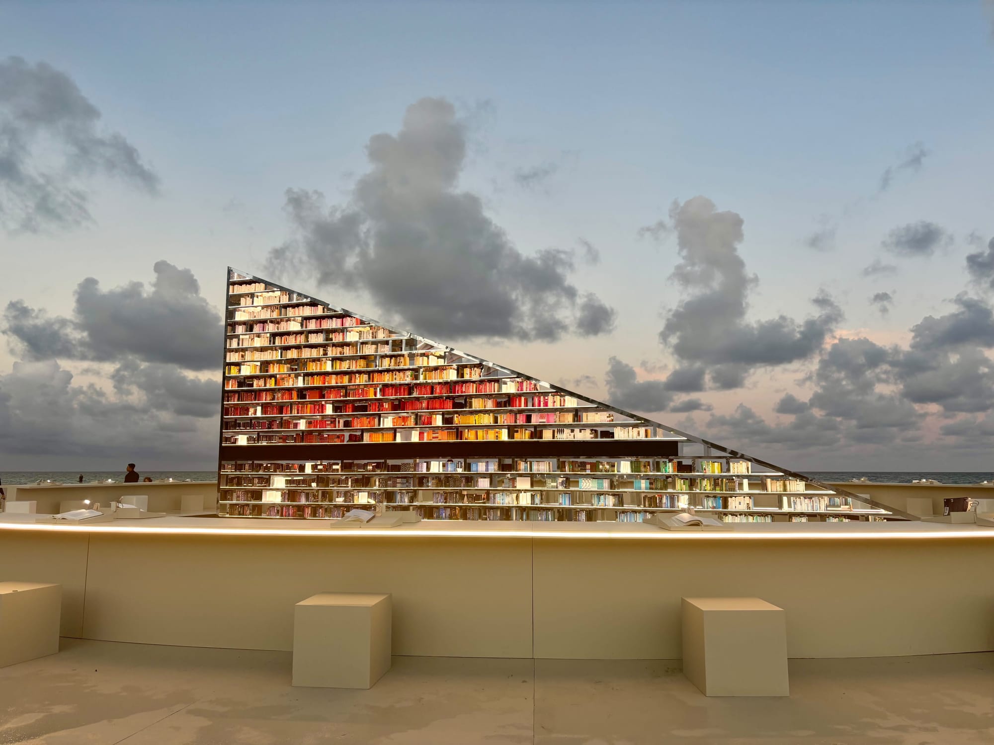 The British artist known for her ambitious, large-scale interventions like an immersive choral sculpture outside London's Tate Modern and for visionary stage designs for the likes of Beyoncé and The Weeknd is bringing a true “go big or go home” approach to Miami this week. Es Devlin will plunk a 50-foot-round revolving library on the sands of Miami Beach, complemented by installations inside the nearby Faena Cathedral and Project Room. The centerpiece rotating library, which boasts 2,500 books that have informed the artist's practice and life philosophy, takes on an urgent significance against the backdrop of record-breaking book bans across the state of Florida.