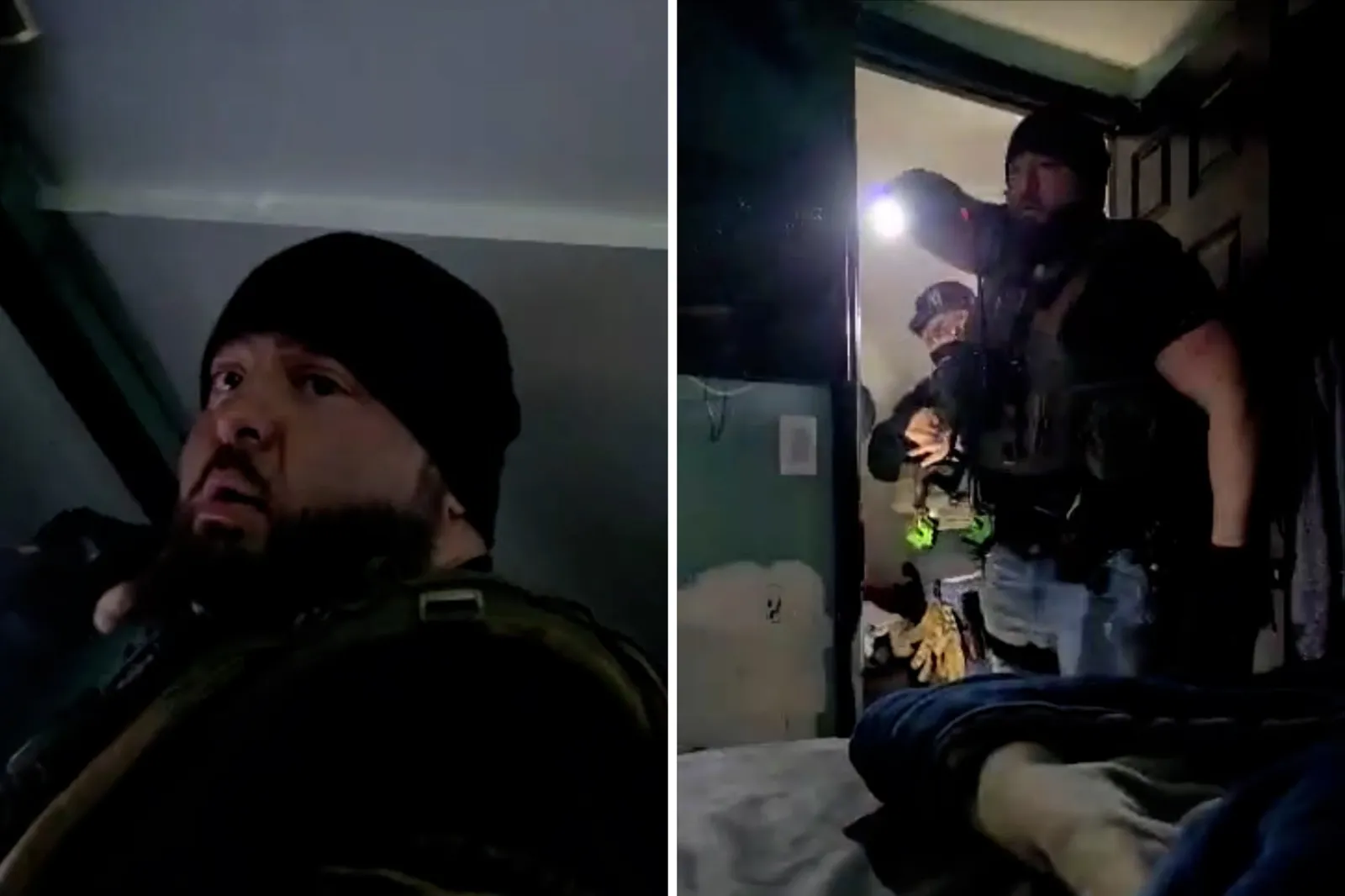 Agents opened a bedroom door forcefully, with a flashlight directed toward a woman holding a recording device, footage from inside the home shows.
