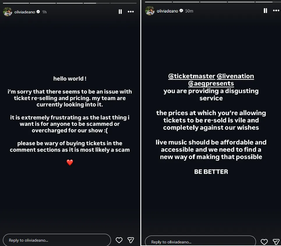 Singer Olivia Dean had some choice words for ticket sellers after her upcoming tour sold out and tickets immediately appeared for resell at escalated prices.