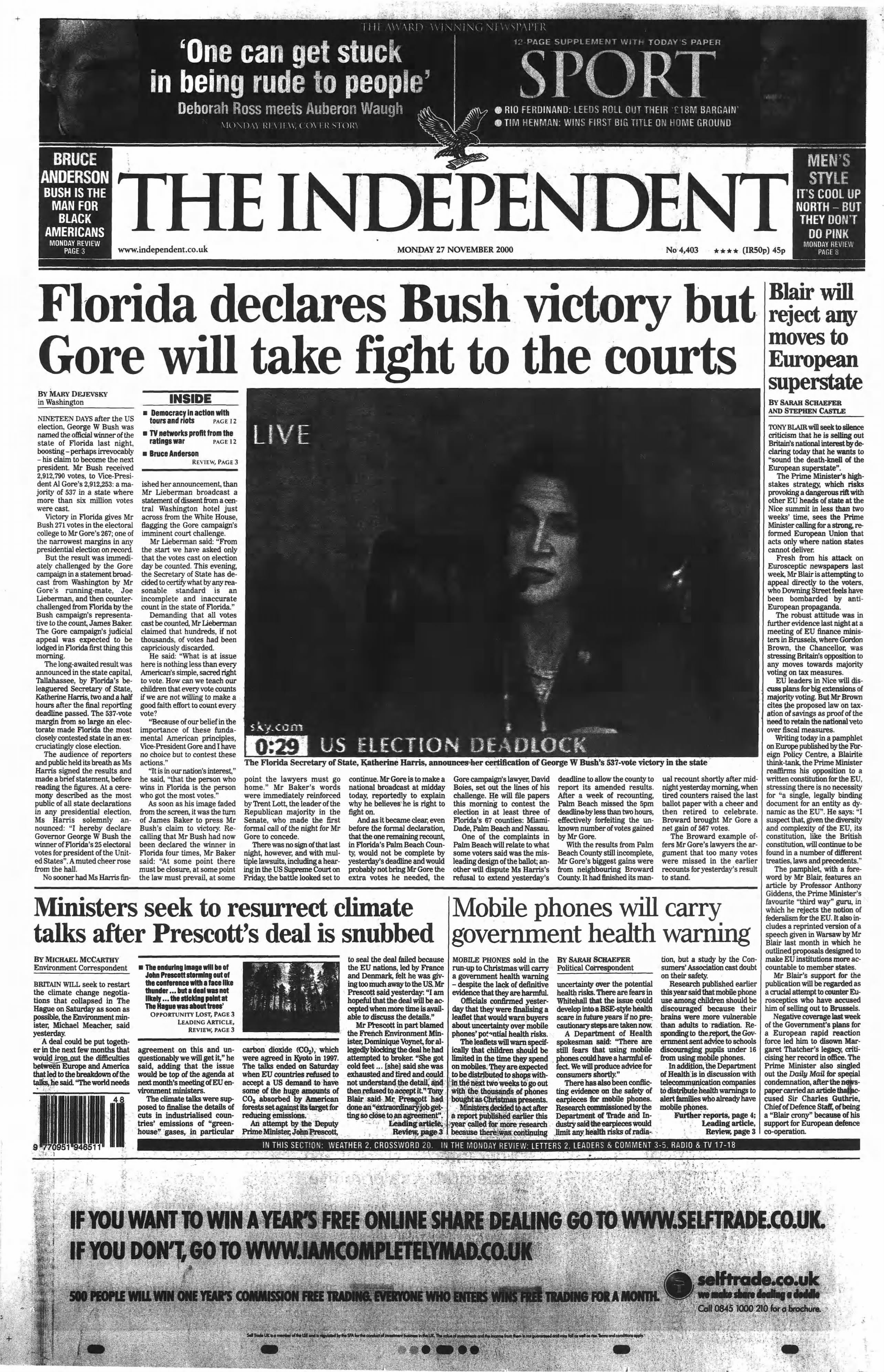 open image in gallery(The Independent)27 November 2000 – US election deadlock