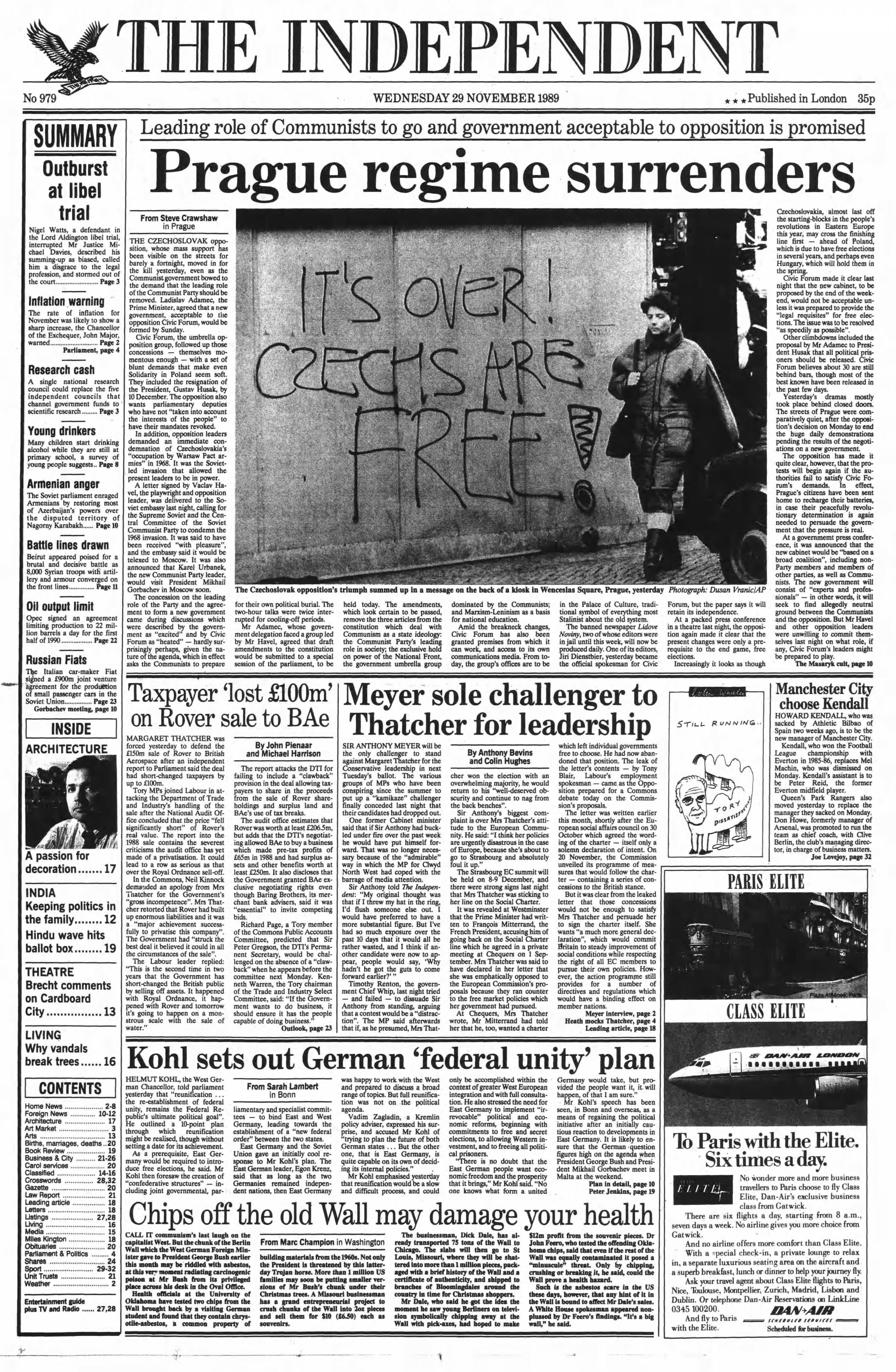 In Prague, the Communist regime agrees to surrender power as mass protests continue to fill the streets. The climbdown marks a defining moment in the Velvet Revolution and sets Czechoslovakia on a path toward democratic reform.