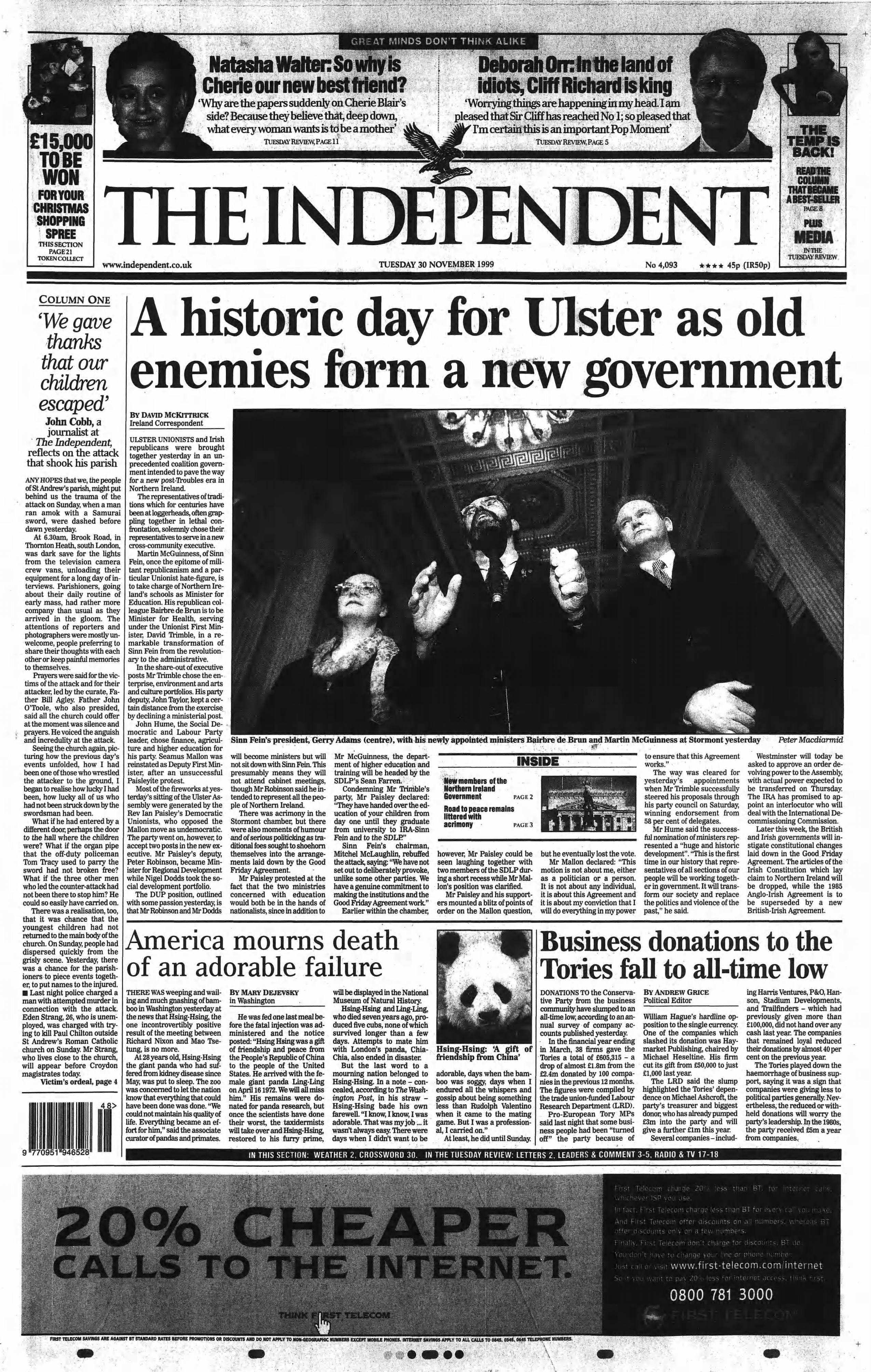 open image in gallery(The Independent)30 November 1999 – Power share in Northern Ireland