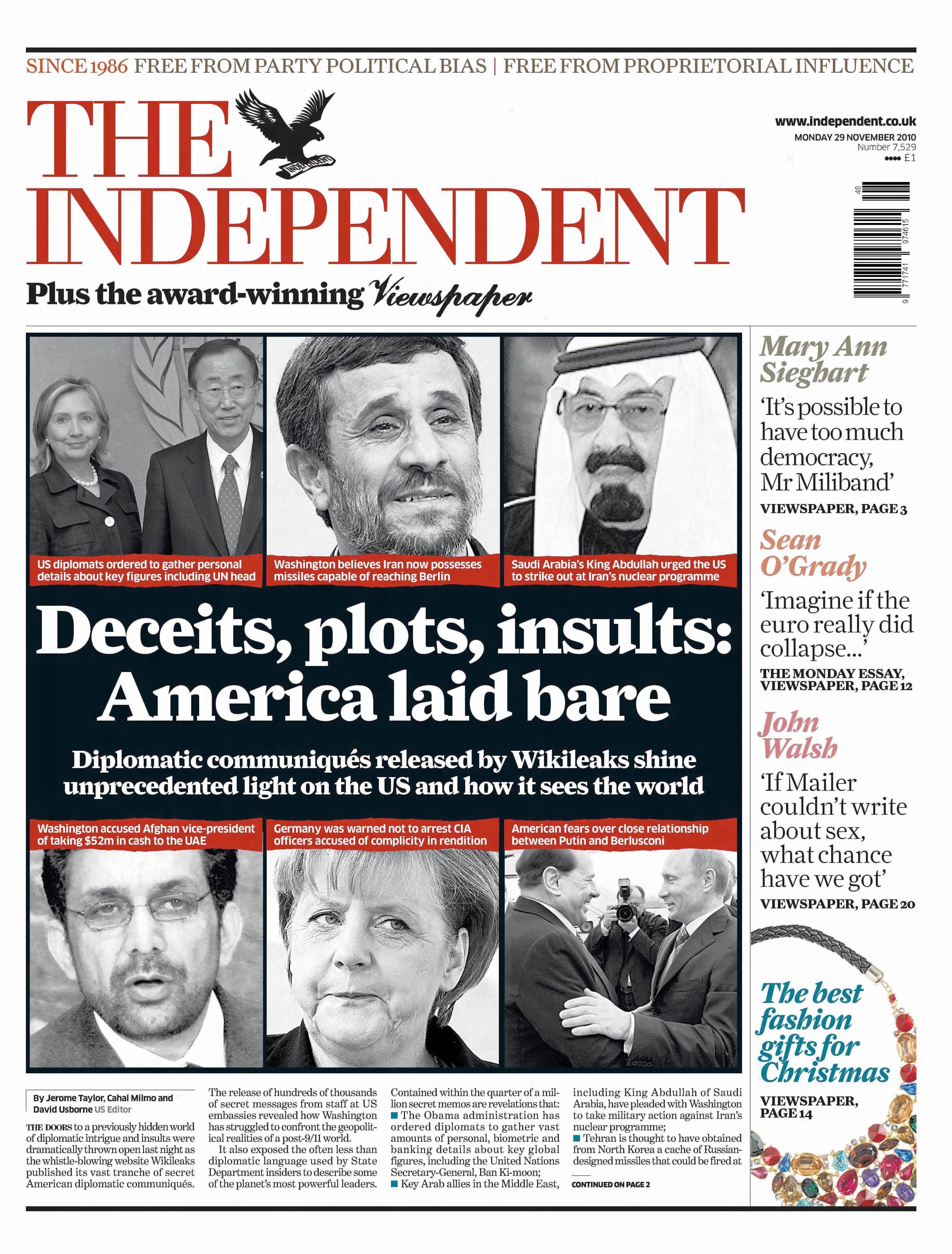 WikiLeaks releases a vast archive of US diplomatic cables, exposing candid assessments of allies and adversaries and triggering global diplomatic fallout. The Independent calls out the “deceits, plots and insults” laid bare by the leak.