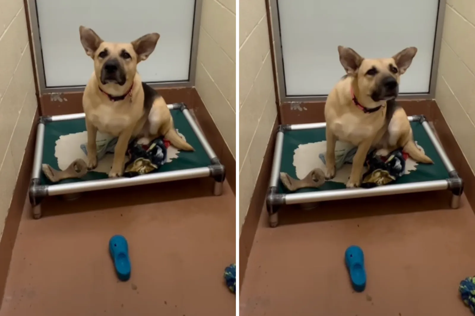 Julie Saraceno (@jsacareno) shared footage of Mommas, a shepherd mix, clearly saddened by the chaotic shelter environment and her confined space.