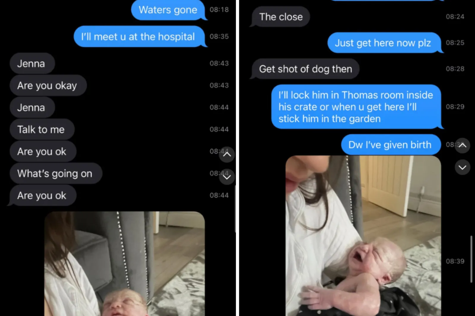 Another screengrab shows Hadley texting her mother to "get here now" at 8:25—followed by one at 8:39 a.m. saying "dw [don't worry] I've given birth," and a photo of the newborn at home.