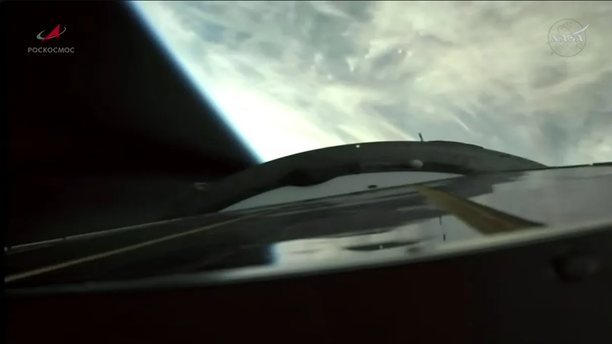 Sergey Kud-Sverchko reports "Everything's fine on board; we're feeling great."Meanwhile, the rocket's extetnal cameras have captured a view of a cloudy Earth receding behind it.