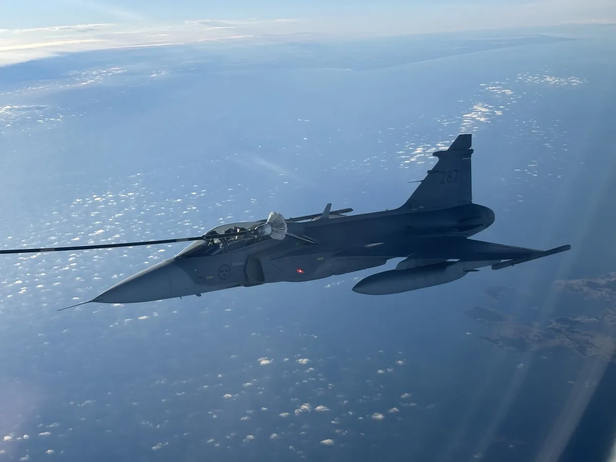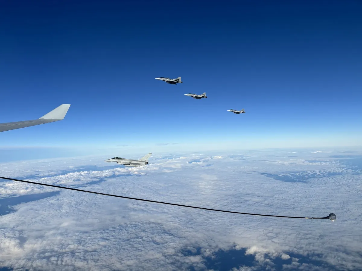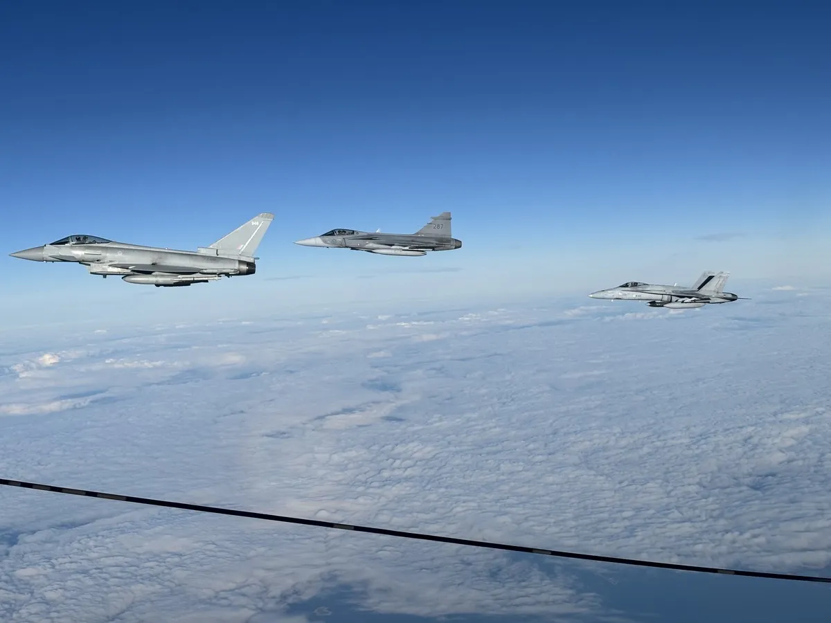 Two British Typhoon jets, four Swedish Gripen aircraft and two Finnish F/A-18s refueled from one of the U.K.’s Royal Air Force (RAF) Voyager tankers as it swept from the country's Brize Norton base in southern England northward, heading for the Baltic states before returning to British airspace via Poland.