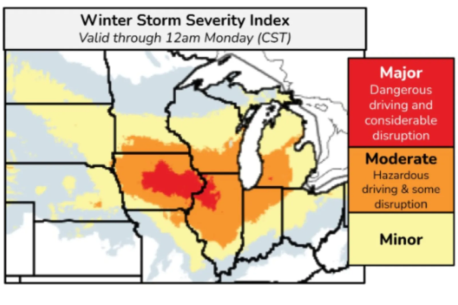 Forecasters warn that the system could create dangerous travel for multiple areas, including Des Moines, Chicago, and Milwaukee.